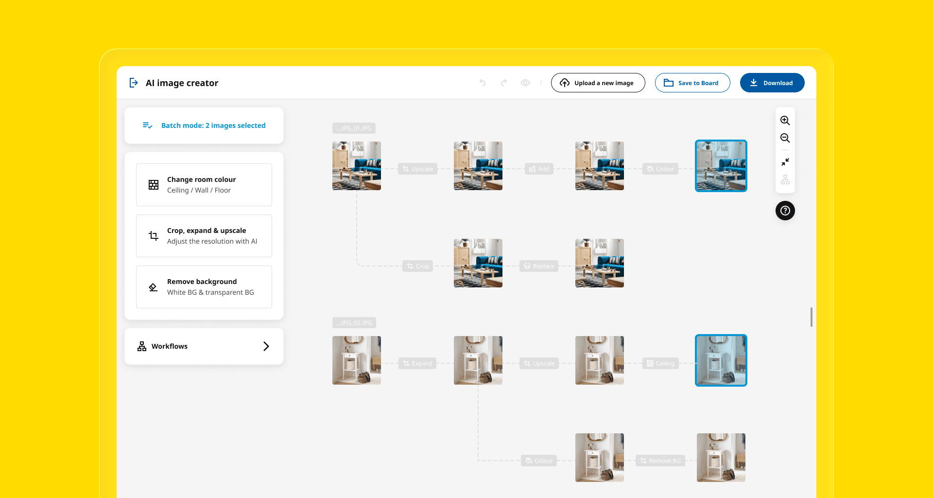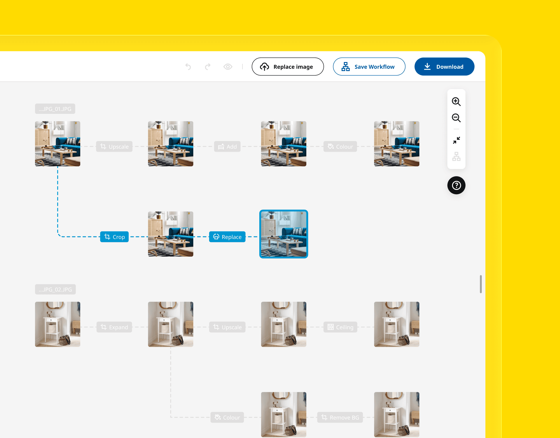 In the workflow view, double-clicking an image enters single-image editing mode. Clicking an operation node allows users to modify the operation settings. Clicking an image allows users to replace the original image or save the workflow.