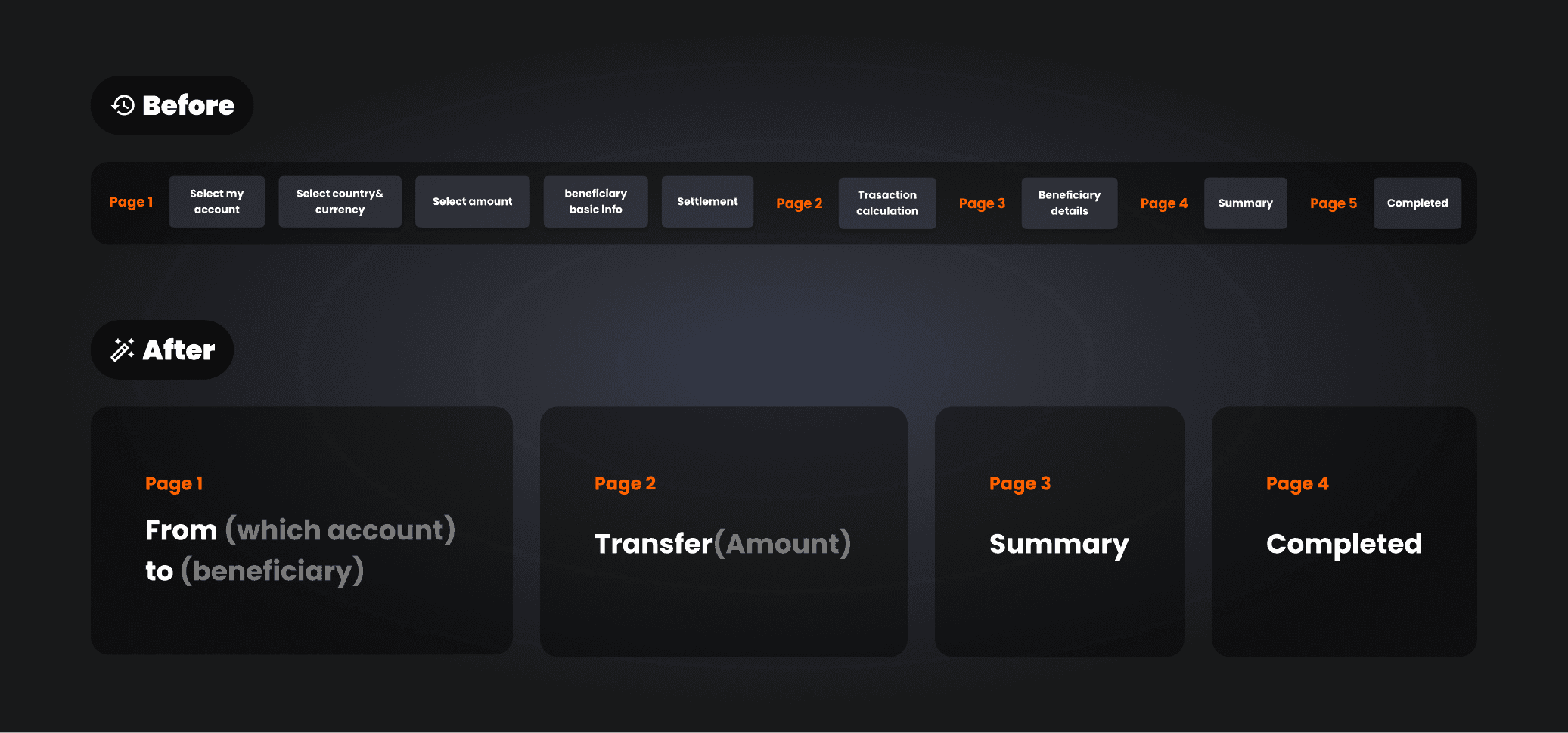 The previous Global Transaction page was expanded from the original SEPA(Single Euro Payments Area) transfer design to accommodate evolving business needs. Over time, as business scope and compliance requirements changed, the user journey became increasingly complex and bloated.